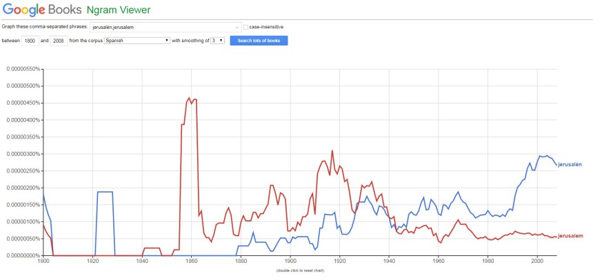 Para finalizar el análisis cibernético, en el recurso Ngram Viewer de Google se obtiene la siguiente gráfica comparativa, que revela que el uso de Jerusalem ha venido reemplazándose por el de Jerusalén a partir de los años 1940[34].
