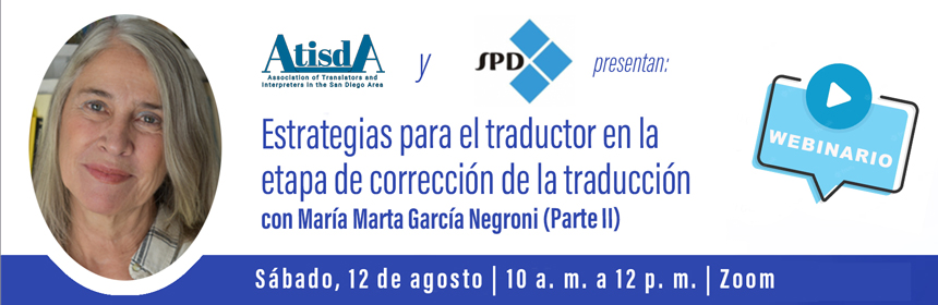 La División de Español de la American Translators Association (ATA SPD) y la Asociación de Traductores e Intérpretes de San Diego (ATISDA) invitan a un webinario imperdible con la Dra. María Marta García Negroni.