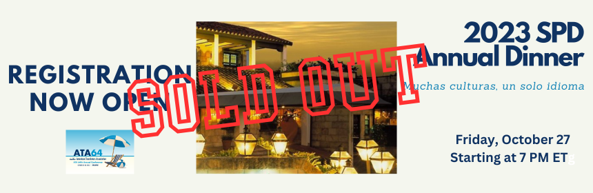 ATA64_SPD Annual Dinner_SOLD OUT_860x280 Posted on October 20, 2023 by ataspd Previous Return to ATA64: 2023 SPANISH LANGUAGE DIVISION ANNUAL DINNER – REGISTRATION IS NOW OPEN