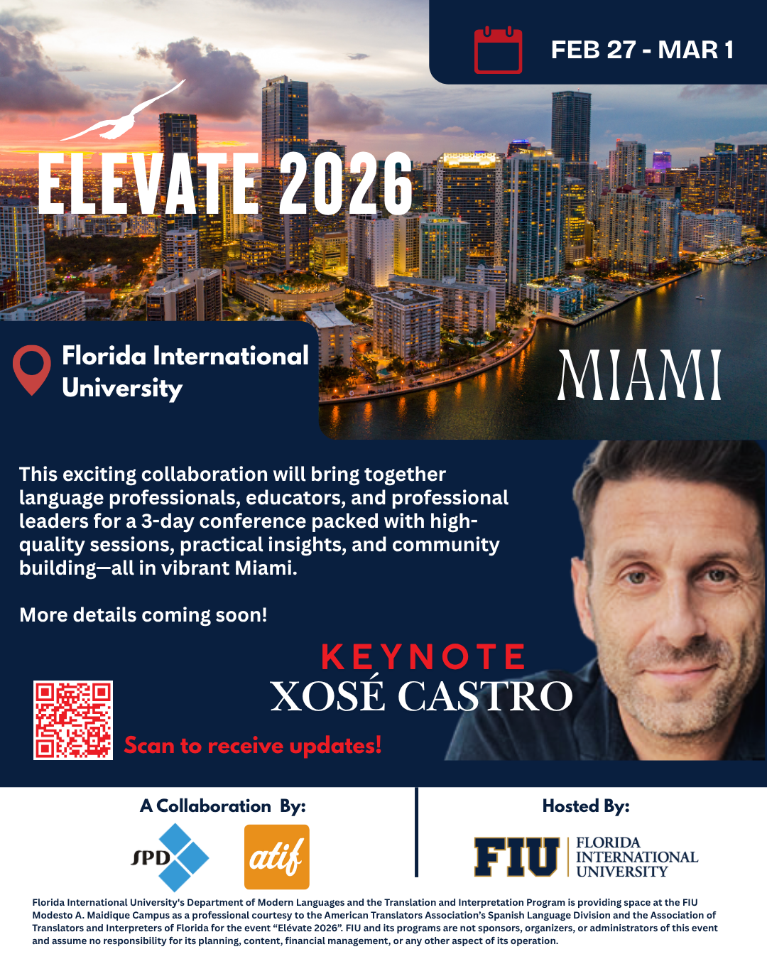 DISCLAIMER: Florida International University’s Department of Modern Languages and the Translation and Interpretation Program is providing space at the FIU Modesto A. Maidique Campus as a professional courtesy to the American Translators Association’s Spanish Language Division and the Association of Translators and Interpreters of Florida for the event “Elévate 2026.” FIU and its programs are not sponsors, organizers, or administrators of this event and assume no responsibility for its planning, content, financial management, or any other aspect of its operation.